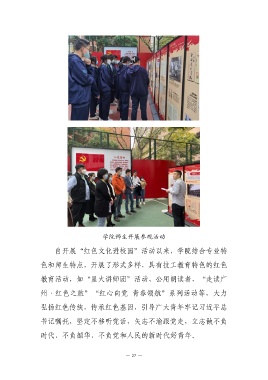学院师生开展参观活动 自开展“红色文化进校园”活动以来,学院结合专业特 色和师生特点,开展了形式多样、具有技工教育特色的红色 教育活动,如“星火讲师团”活动、公用朗读者、“走读广 州·红色之旅”“红心向党 青春领航”系列活动等,大力 弘扬红色传统,传承红色基因,引导广大青年牢记习近平总 书记嘱托,坚定不移听党话,矢志不渝跟党走,立志做不负 时代、不负韶华、不负党和人民的新时代好青年。 — 27 —