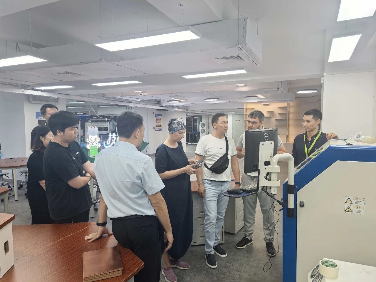 活动现场,哈萨克斯坦DOSTI创新中心代表来到学院电子技术集训基地进行参观体验,他们对基地表现出浓厚的兴趣,并不时驻足询问。