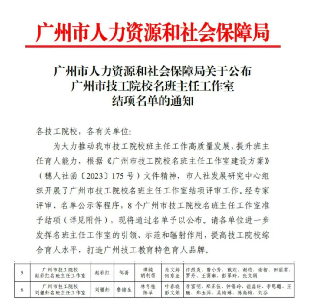 近日,广州市人力资源和社会保障局公布了广州市技工院校名班主任工作室结项评审结果。学院赵彩红名班主任工作室、刘堰虾名班主任工作室作为广州市技工院校首批立项建设的名班主任工作室,自2023年7月获批建设以来,历经两年的深耕细作与持续探索,凭借鲜明的育人特色、扎实的建设路径和丰硕的实践成果,顺利通过专家组评审,成功获得结项!