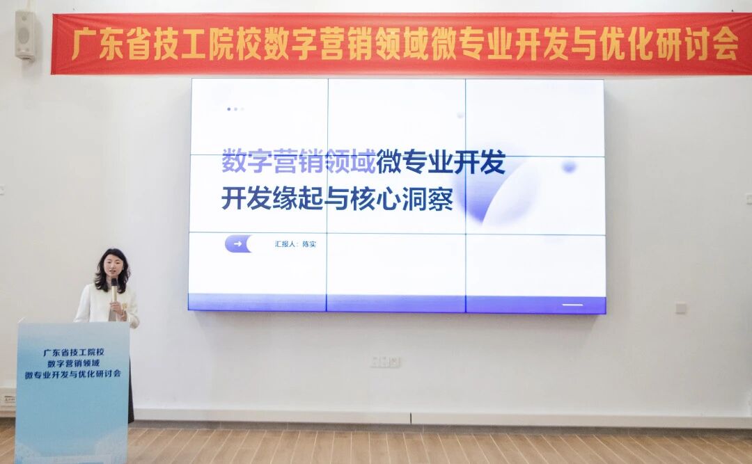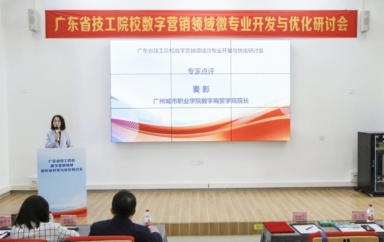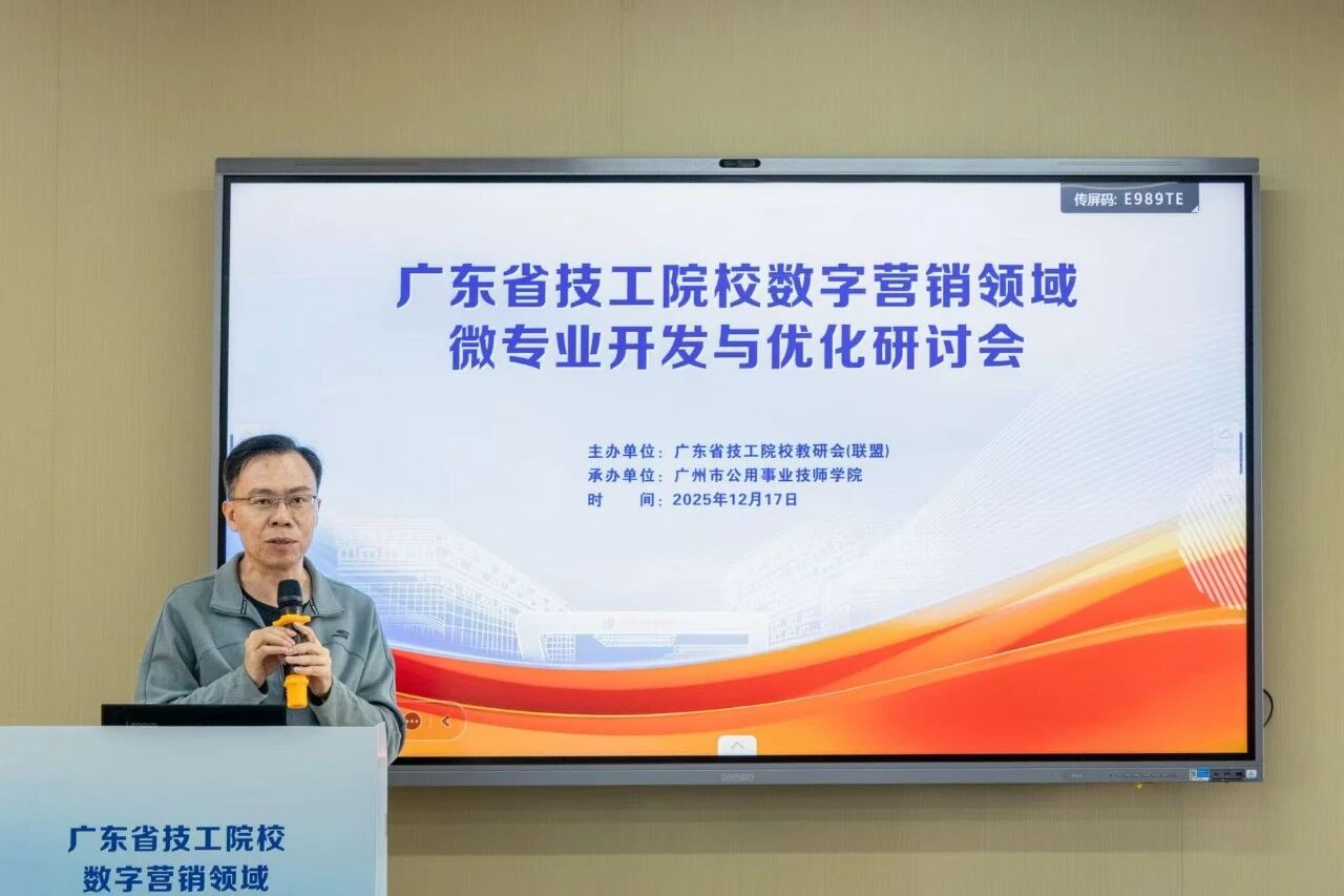 随后,广东省职业技术教研室相关科室围绕“产教评技能生态链背景下的技工院校微专业开发”作专题分享,从政策要求、建设路径、实践要点等方面,为全省微专业建设明晰方向;广州市技师学院副院长陈实聚焦“数字营销领域微专业开发”,分享了标杆院校的专业建设思路与育人模式;学院社会服务产业系主任黄辉城以《数字营销微专业方案构建与组合策略》为题,从微专业定位、融合路径、应用示例及优化机制等方面,展示了学院在数字营销微专业建设中的探索与思考;学院副院长王尚军则从微专业与主专业的边界、微专业的开发逻辑、教学组织形式和考核等方面进行分享;广东省电子商务技师学院副院长黄文苑以《短视频创作与推广》为例,拆解“从岗位任务到微课程模块”的开发逻辑,干货满满。