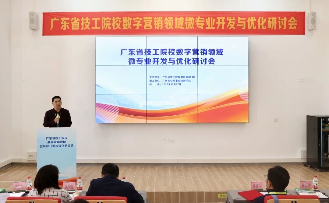 2025年12月17日,由广东省技工院校教研会(联盟)主办、广州市公用事业技师学院承办的广东省技工院校数字营销领域微专业开发与优化研讨会在学院科教城校区顺利落幕。来自广东省职业技术教研室、广东省战略性产业人才培养与评价联盟、广东今日头条科技有限公司及全省51所技工院校的领导、骨干教师们齐聚一堂,以专题分享、深度研讨、实地观摩的形式,共话数字营销微专业建设的核心议题,为全省技工教育微专业建设提供了可借鉴的实践范本。研讨会由学院副院长王尚军主持。